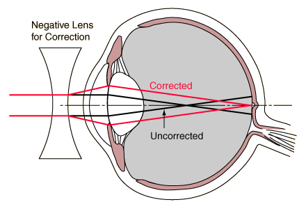 Myopia results when the focusing power of the cornea and lens is too strong. The focal length in the eye is too short, so the image plane is in front (instead of on) the retina (see Fig. 1 below). Conceptually, this problem can be corrected by placing a diverging lens in front of the eye. This lens will push the focal point back onto the retina, resulting in clear vision.