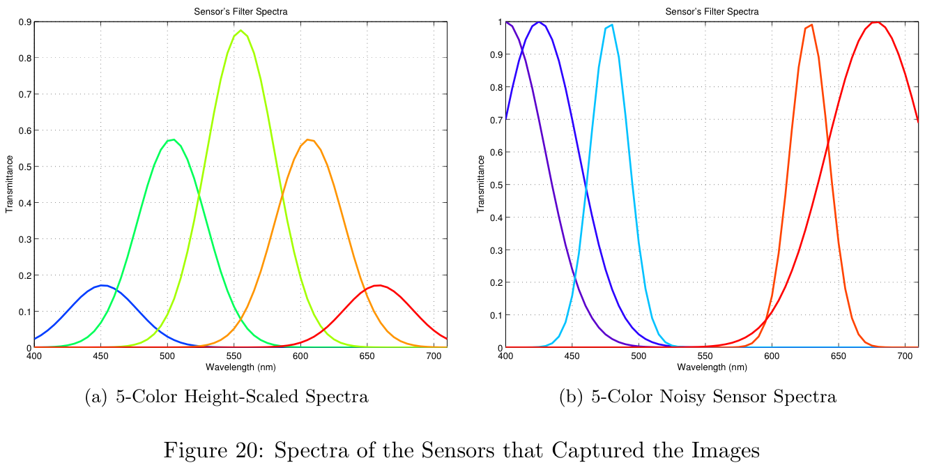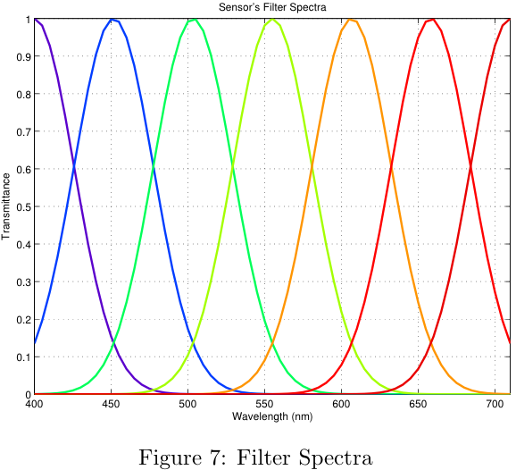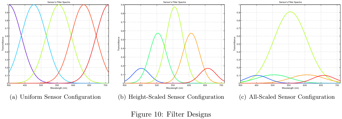 As a baseline, we created a set of sensors with uniform spacing between the filter centers, equal magnitudes for each filter, and equal filter widths. An example of this configuration's filter spectra is shown in Figure 10a.