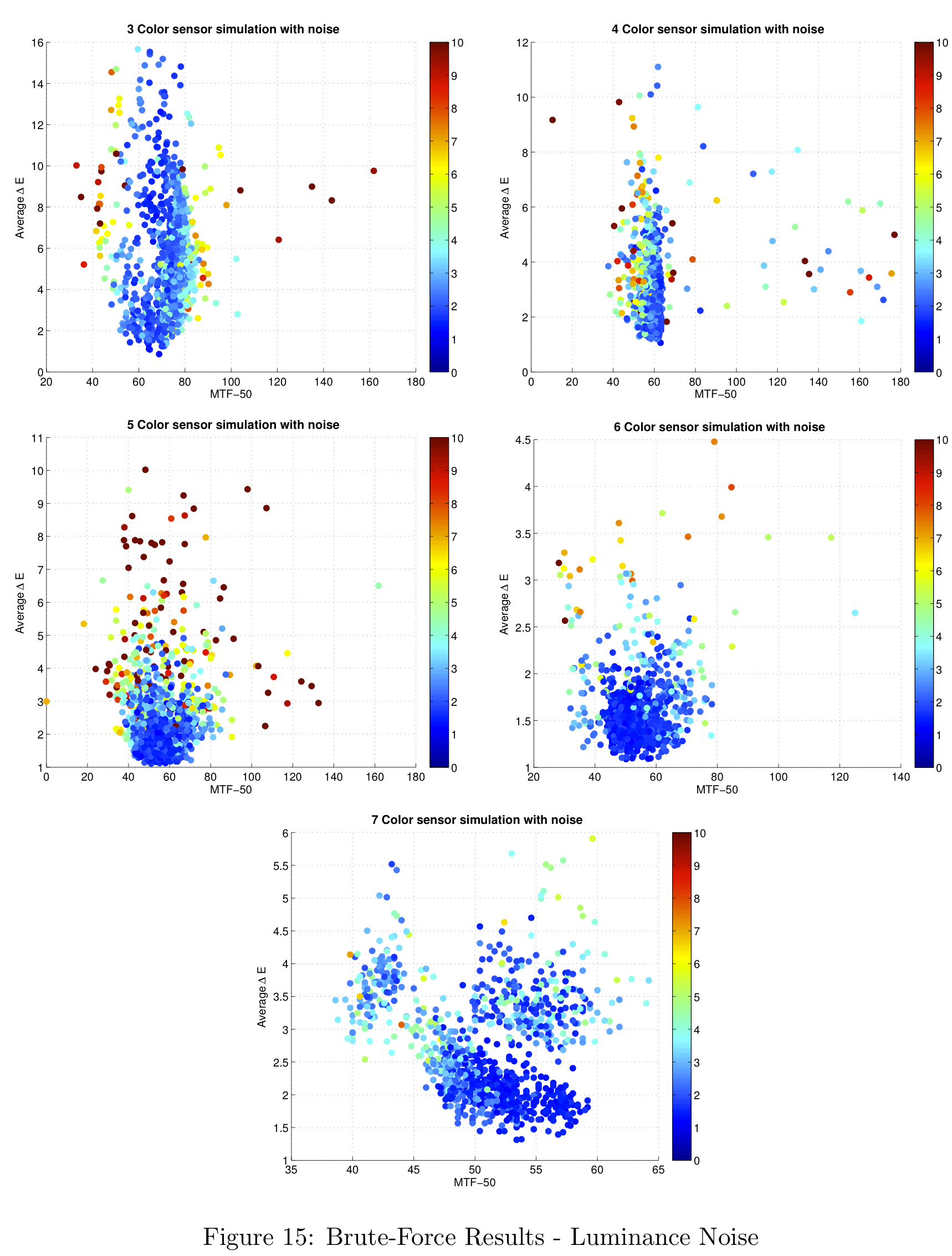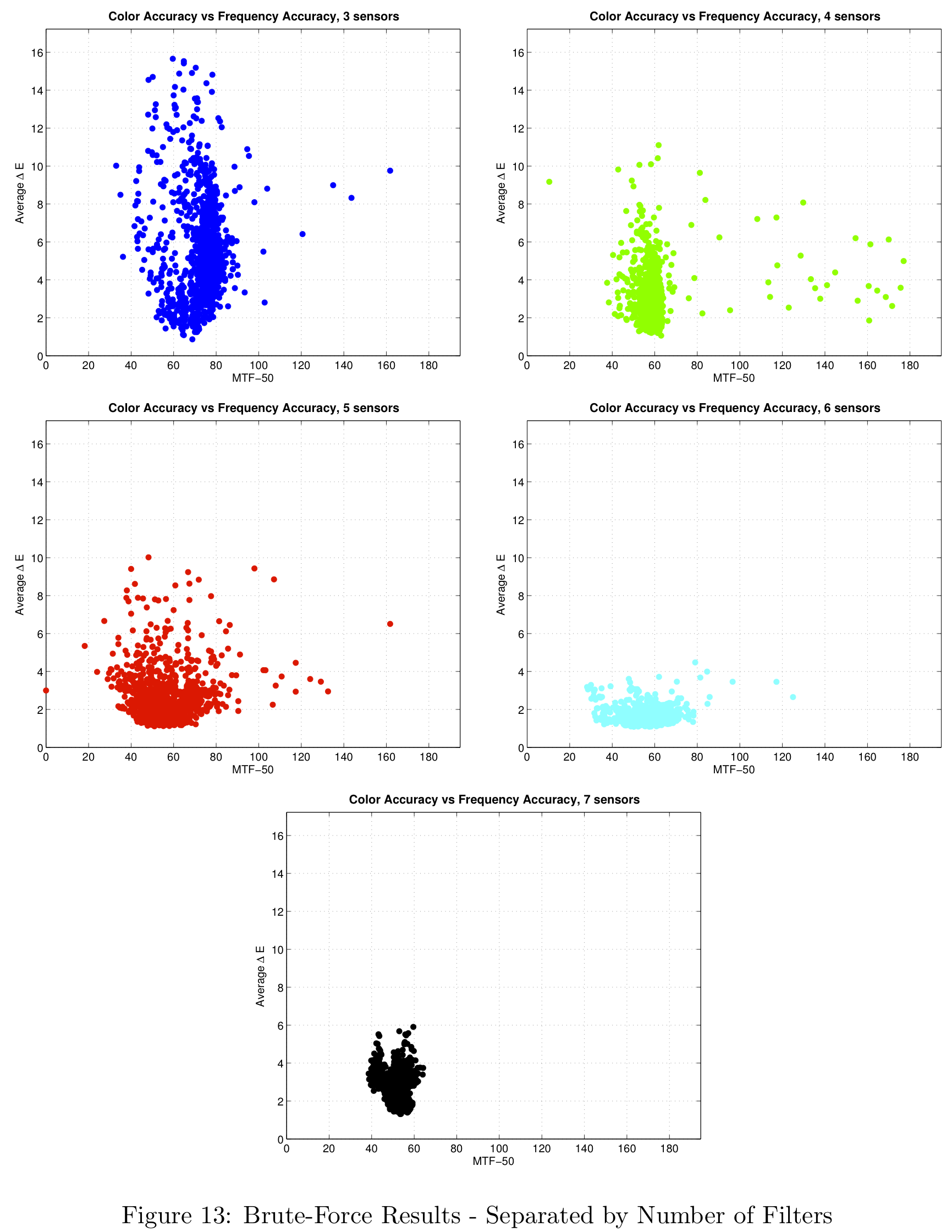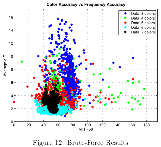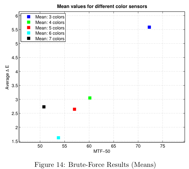 Figure 12 shows the results that were generated for 3 to 7 color sensors. We can see that the distribution gets tighter as the number of colors increases and that the delta-E value seems to approach a limit at around 1. Note that in this figure, a lower delta-E is better and a higher MTF-50 is better, so that the theoretical optimal sensor will be in the bottom right corner.