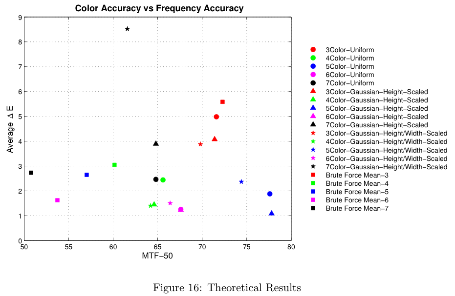 The results from the brute-force analysis are represented by box-shaped symbols. Notice the theoretical results typically exceed the performance of the mean in both color accuracy (lower average Delta-E) and spatial frequency response (MTF-50). The theoretical results do not, however, represent the best possible design.