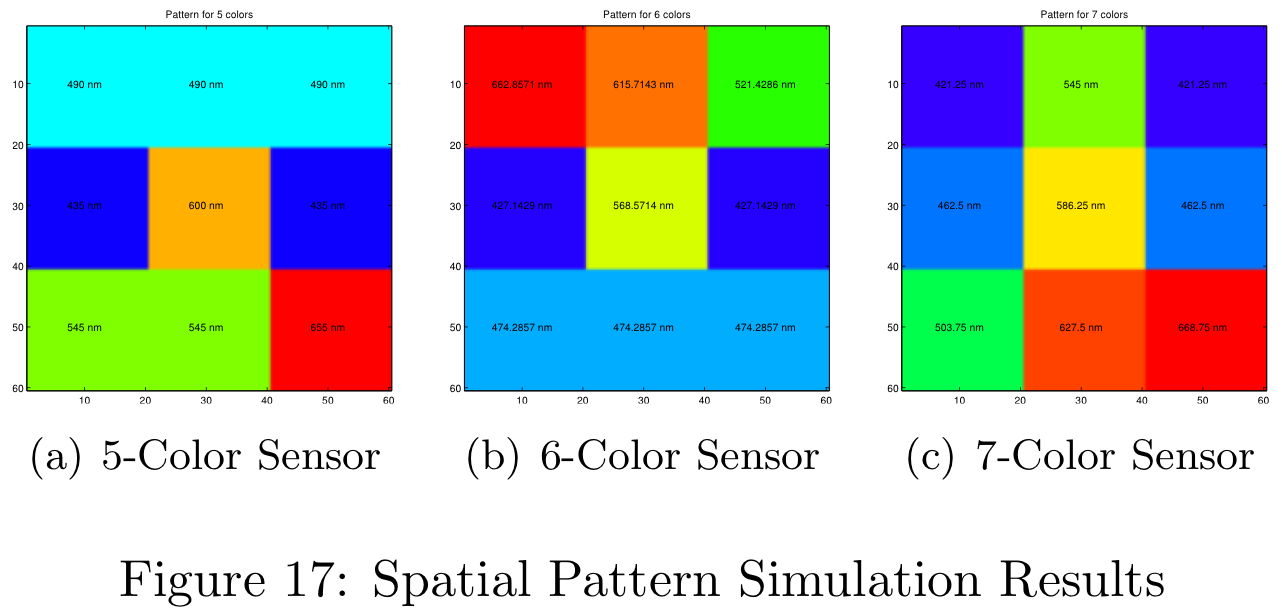The first part of the design problem was to determine the specifications for the color filters. The second part of the design problem is to determine where the filters should be placed on the physical sensor grid. In order to determine the best physical layout, another brute-force simulation was run to iterate over a number of different design configurations. The results shown in Figure 11 were taken from a simulation with 5000 different sensor configurations. Each of the simulations was run with color filters satisfying the "Uniform" design criteria, mentioned in Theory-Based Simulation section.