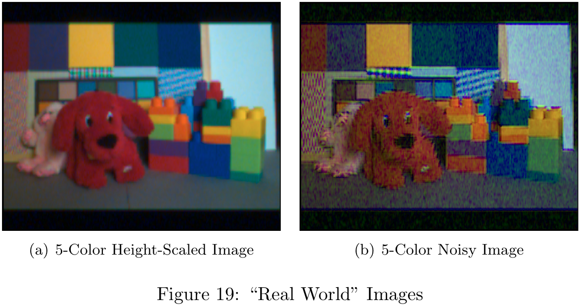 The spectra shown in Figure 20a represents the best theoretical results shown in Theoretical Results section. The image resulting from this design (Figure 19a) is of reasonable quality. The spectra shown in Figure 20b represents a sensor with poor results from the brute-force simulation. Notice the center of the spectrum is almost completely neglected. Since the human visual system is particularly sensitive to this middle-range of wavelengths, the final image (Figure 19b) is of poor quality.