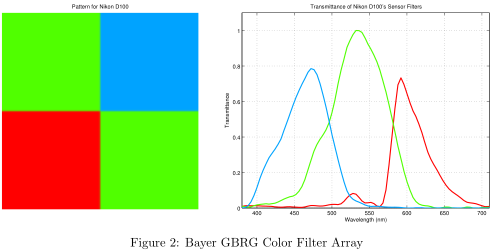 The most common arrangement for a color filter array, called the Bayer pattern is shown below. As can be seen in Figure 2, the pixels of the sensor are covered by red, green and blue filters. The transmittance functions for the filters of a Nikon D100 camera are shown on the right (From ISET).
