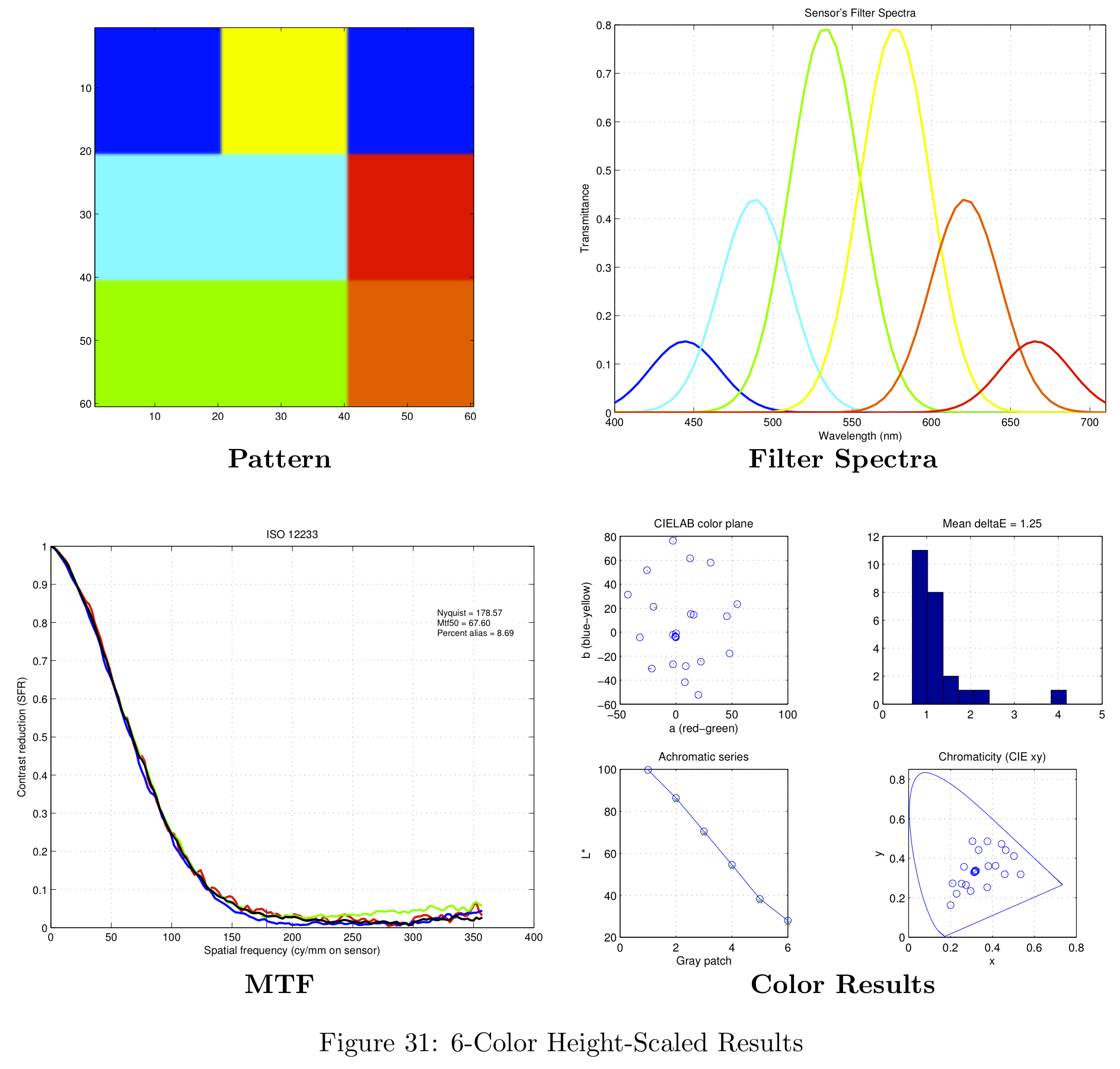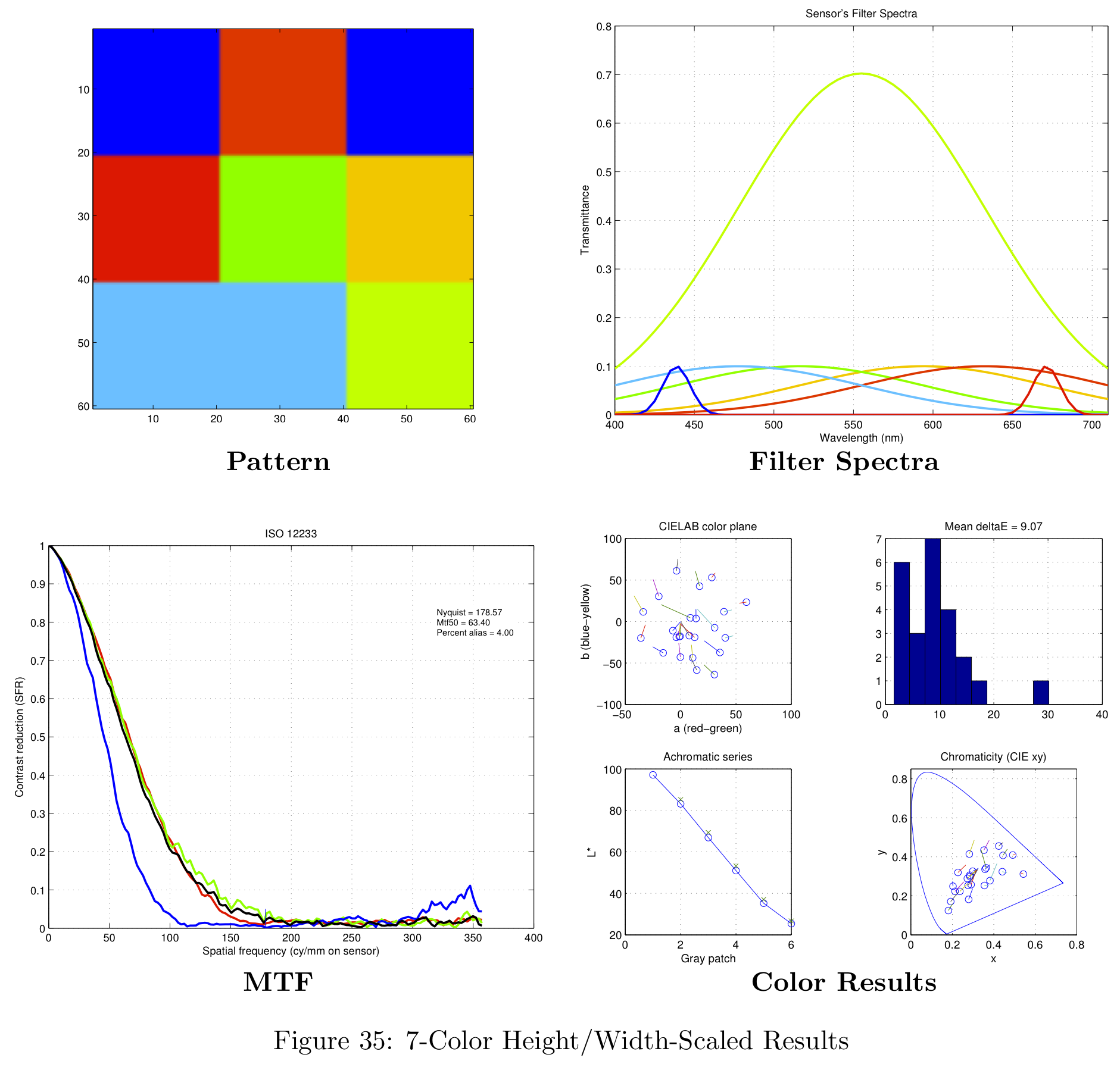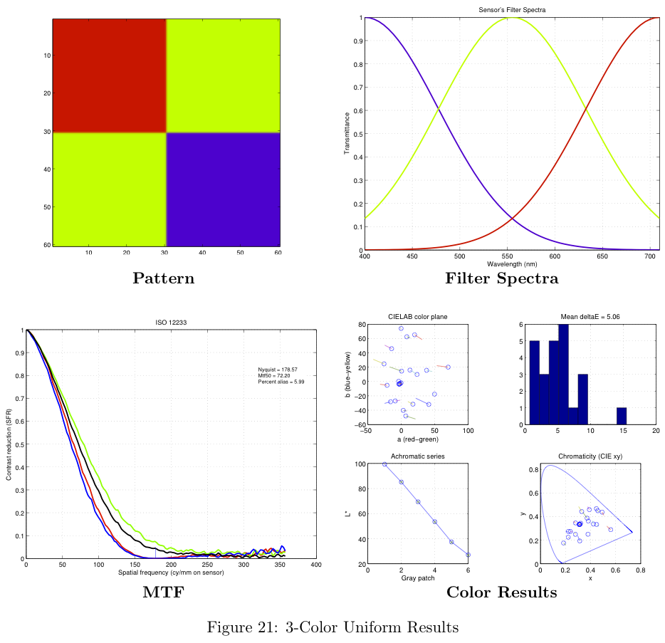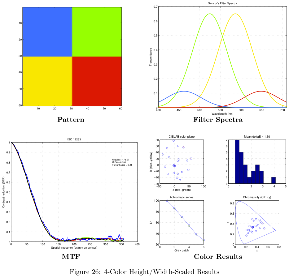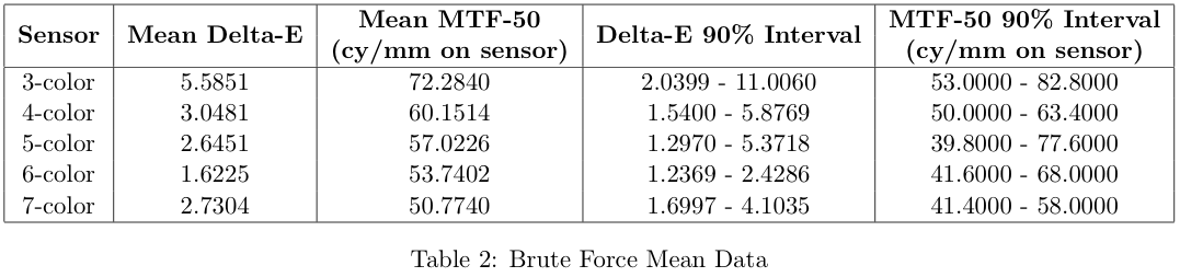 These color filter arrays are not necessarily the best possible choices for real-world images, they are simply the best choice given the Average Delta-E / MTF-50 tradeoff.