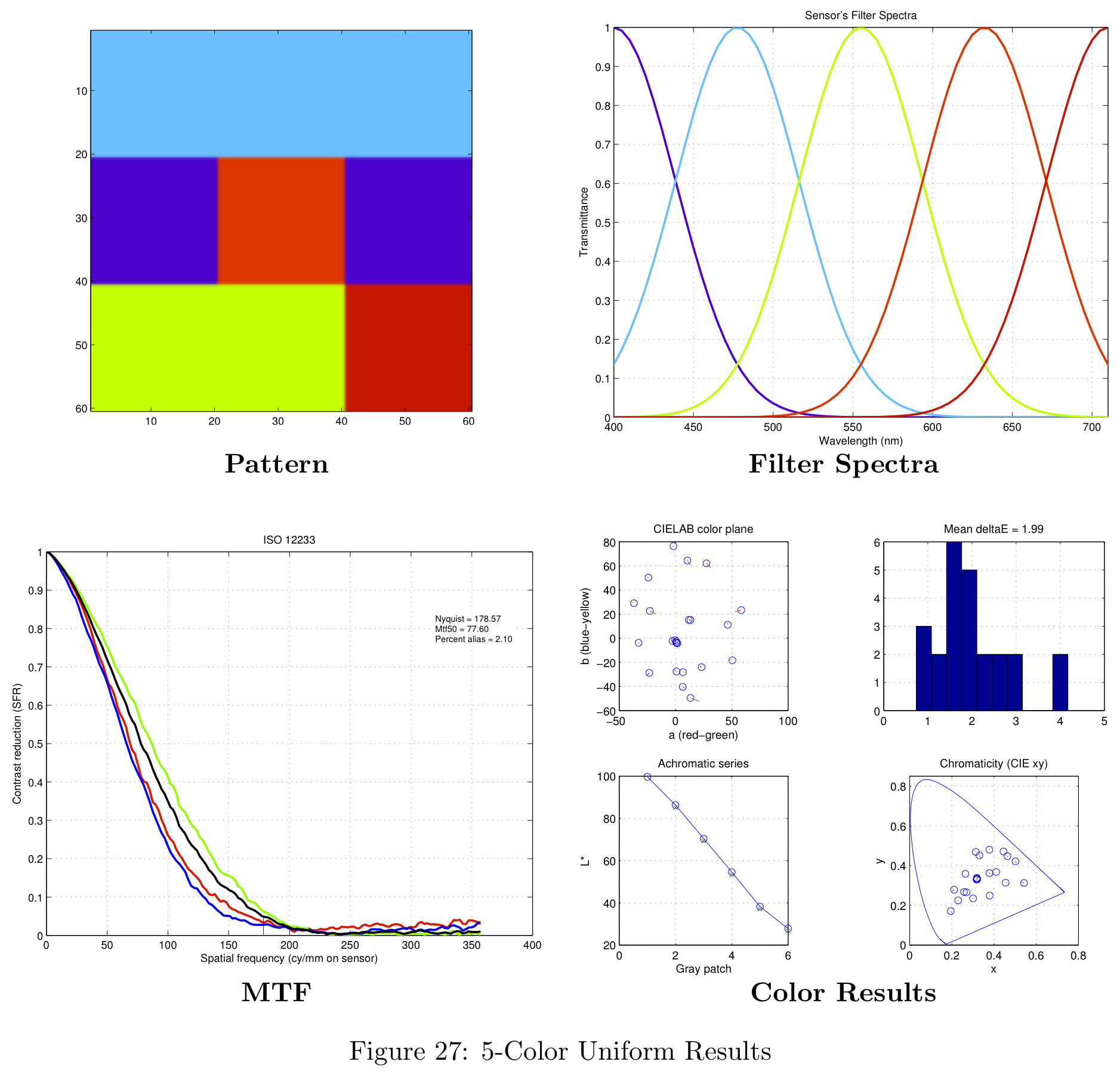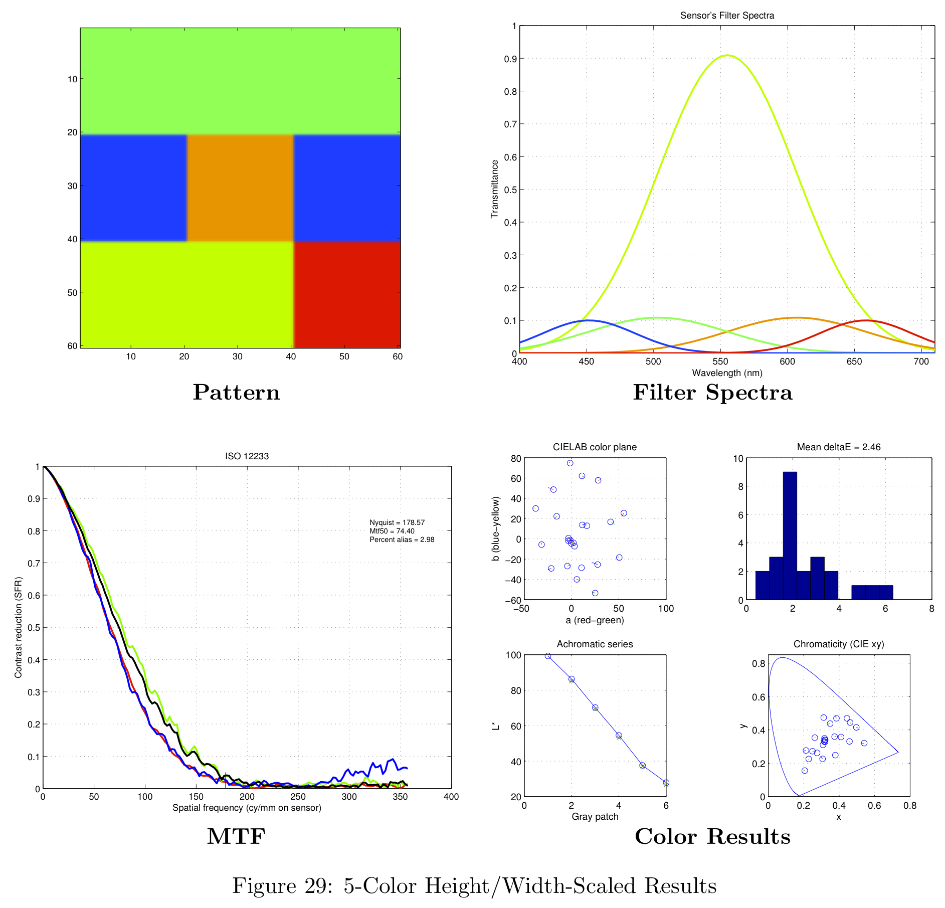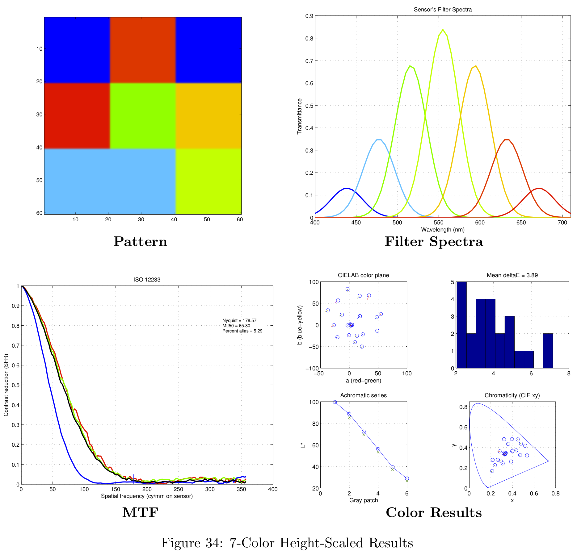 These color filter arrays are not necessarily the best possible choices for real-world images, they are simply the best choice given the Average Delta-E / MTF-50 tradeoff.