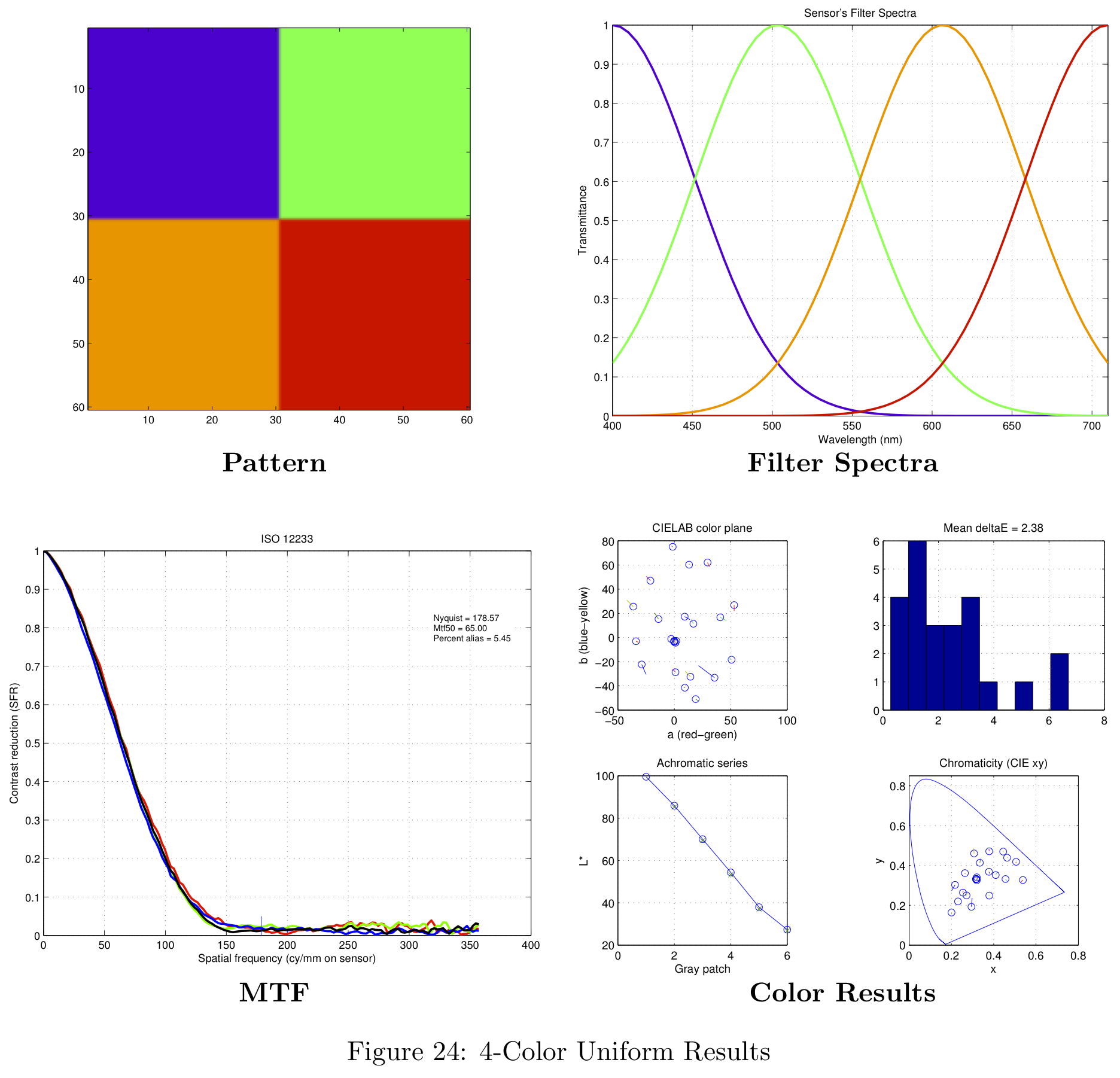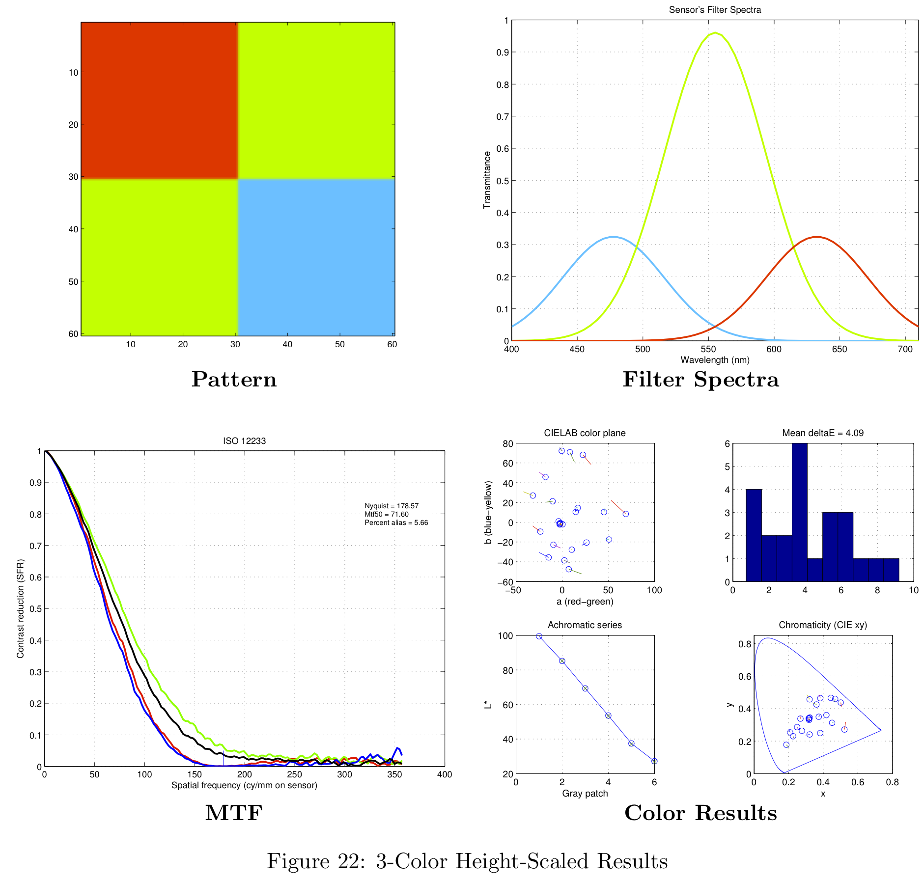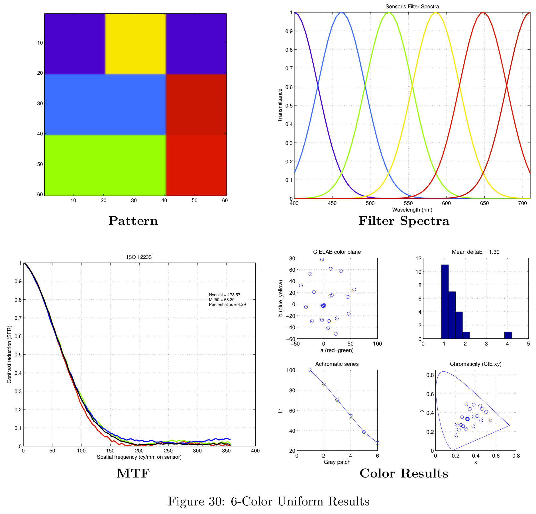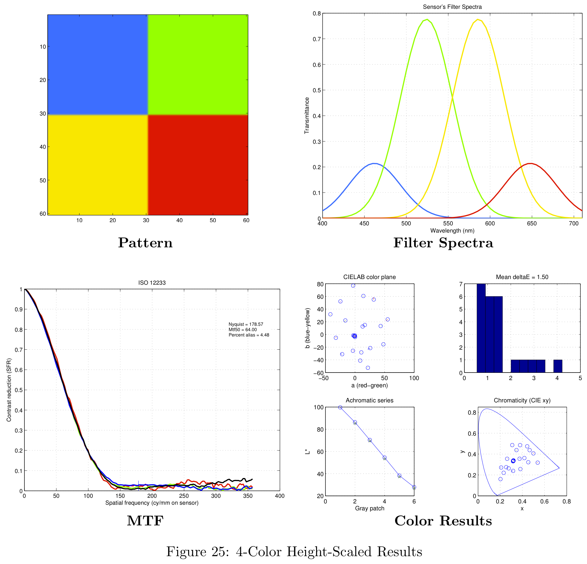 These color filter arrays are not necessarily the best possible choices for real-world images, they are simply the best choice given the Average Delta-E / MTF-50 tradeoff.