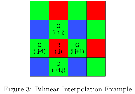 Due to the trichromaticity of color vision we need a red, green and blue value for each pixel, but in the filter array each pixel can only be red, green or blue separately. This means that we need to estimate the missing values, which is known as demosaicking. As described by Joyce Farrell in [2], this is quite a complex problem and there are various methods that have been developed for it. These include methods that interpolate the color planes separately as well as methods that use data from all the color planes in calculating each value. The focus of this project is not directly on these algorithms, but it is nonetheless valuable to know a little about the demosaicking scheme used since it has a large influence on the results. The ISET software used for this project implements a simple bilinear interpolation scheme for demosaicking. This method, as well as a newer high-quality linear method for demosaicking is described by Malvar in [4]. The bilinear method calculates the missing color at a pixel by taking an average of the neighboring pixels that have that color. For instance, the green value of the red pixel "R" in Figure 3 is calculated by taking the average of the surrounding green pixels: