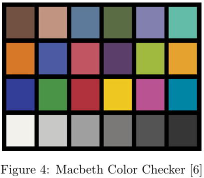 The ability of the color filter array to reproduce the image that is incident on the sensor is evaluated by using a perceptual color metric, namely the CIELAB(1976) delta E value which calculates the perceptual difference between the two images. A perceptual method is used because the only differences that are important to the user are those that can be seen with the human eye. Unfortunately there is no ideal metric that can tell us exactly how the human visual system will see a scene, but for large uniform patches of color, such as the Macbeth chart (Figure 4), the CIELAB metric gives good results. The color reproduction of the CFA is evaluated by using a Macbeth color chart under a known illuminant as the scene, computing the image after processing and comparing the resulting colors to the known values for the Macbeth color chart under that specific illuminant.