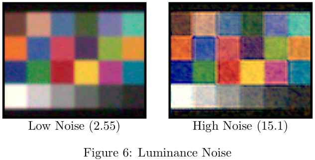 The luminance noise is calculated for each of the squares in the grey series of the Macbeth Color Checker. Below is an example of what luminance noise looks like. For high noise there are darker and lighter patches within each square of the color chart.