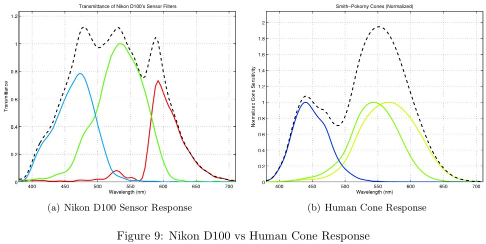 The overall sensitivity of human cones is more sensitive in the middle wavelengths (~550nm) and less sensitive at the extremes (380nm and 710nm). Also notice the overall response of the Nikon D100 (Figure 9a) is much more sensitive in the middle wavelengths and tapers off at the extremes.