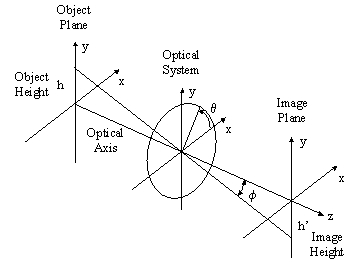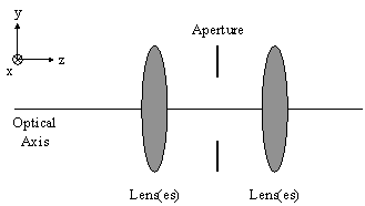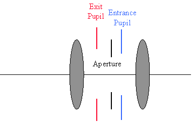 The physical layout for imaging consists of an object plane, an optical system, and an image plane as shown in Figure 1. Right-handed coordinate systems are commonly employed. A typical optical system, illustrated in Figure 2 consists of lenses and an aperture. The aperture limits the amount of light passing through the optical system. The pupils of the optical system are the images of the physical aperture as formed by the front and rear sections of the optics. The Entrance Pupil is the image of the aperture formed by the optics in front of the aperture, while the Exit Pupil is the image of the aperture formed by the optics in back of the aperture. For the particular system shown in Figures 3 and 4, these pupils are virtual images of the aperture. The Exit and Entrance pupil size and location are independent of object and image locations in many systems. Notable exceptions are wide-angle lenses and fisheye lenses.