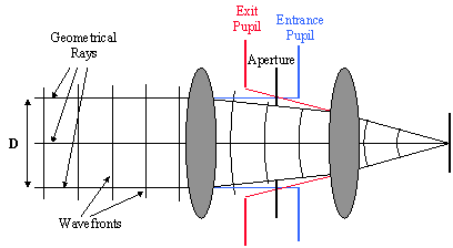 Figure 4 shows the geometrical ray trace for a distant point object. The geometrical rays are normal to the wavefronts. Wavefronts are surfaces of constant phase. As seen in the figure, light from the object initially heads toward the Entrance Pupil, while the light exiting the optical system appears to emanate from the Exit Pupil. This ray trace is for a system with no aberrations, so after propagating through the entire system, the wavefronts are perfectly spherical and the rays converge to a point. Real optical systems, however, are not aberration free and the wavefronts, which are surfaces of constant phase, deviate from sphericity. This illustrates the fact that aberrations introduce phase distortions into the light waves. In addition, the effects of diffraction must also be taken into account.