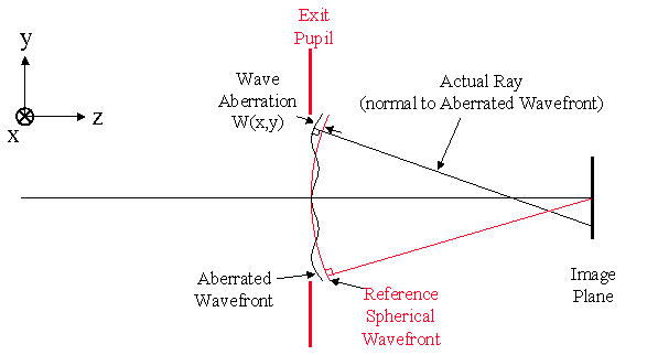 The wave aberration function, W(x,y), is defined as the distance, in optical path length (product of the refractive index and path length), from the reference sphere to the wavefront in the exit pupil measured along the ray as a function of the transverse coordinates (x,y) of the ray intersection with a reference sphere centered on the ideal image point. It is not the wavefront itself but it is the departure of the wavefront from the reference spherical wavefront as indicated in Figure 5.