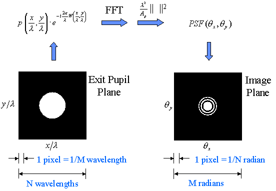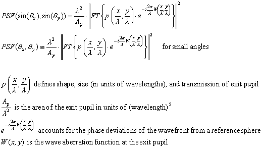 Note that the light forming the image completely fills the Exit Pupil. Also, since the Exit Pupil is the aperture as seen from the image space of the optical system, all of the effects of aberrations in the system are fully contained in the light distribution at the Exit Pupil. The Exit Pupil therefore is good place to define and characterize the nature of the light in an image forming optical system. Once we know the distribution of light (i.e., amplitude and phase) at the Exit Pupil, we can calculate the impulse response or point spread function (PSF) of the optical system using the diffraction integral and Fourier optics techniques [4, 5]. This fully accounts for the effects of both aberrations and diffraction.