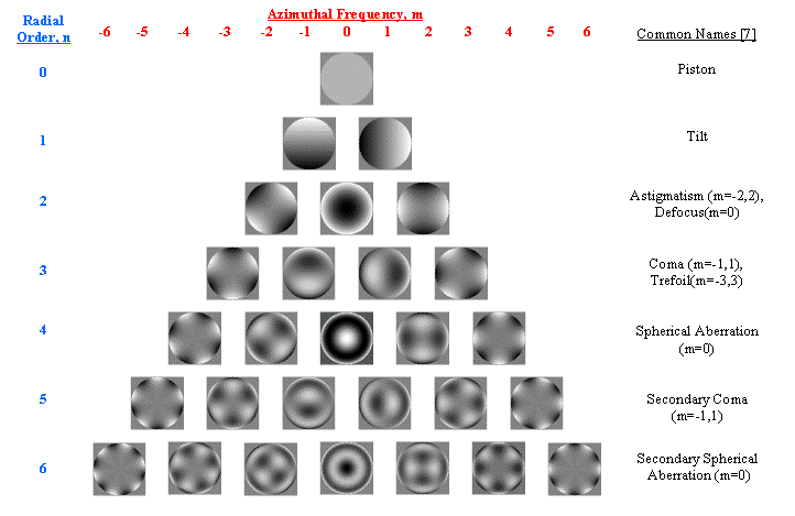 Table 1 contains a list of Zernike polynomials up to order 4 and their meanings relative to the traditional Seidel or Primary aberrations [3, 9, 10].