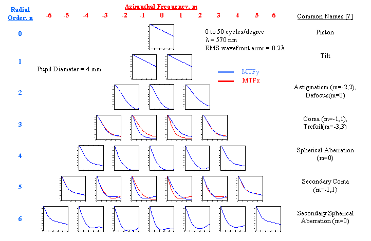 Figure 11. MTFs of of Wave Aberrations Corresponding to Each Zernike Mode up to 6th Order, 4 mm Pupil Diameter, RMS Wavefront Error = 0.2 λ |