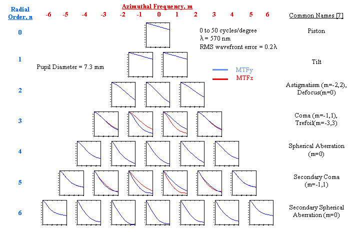 Figure 12. MTFs of of Wave Aberrations Corresponding to Each Zernike Mode up to 6th Order, 7.3 mm Pupil Diameter, RMS Wavefront Error = 0.2 λ |