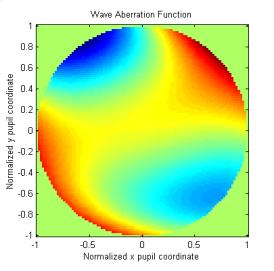 Matlab scripts, WaveAberration.m, WaveAberrationPSF.m, and WaveAberrationMTF.m utilize equation (13) to generate the wave aberration function. These scripts compute and plot W(ρ ,θ ) the PSF, and the MTF for a wave aberration function made up of a weighted sum of Zernike polynomials. Each polynomial is weighted by an RMS wave aberration coefficient. These coefficients are determined from the Wavefront sensor measurements. Table 2 lists the wave aberration coefficients determined from a Wavefront sensor measurement of a patient with a pupil diameter of 5.4 mm [11]. The System or Total RMS wavefront error is the square root of the sum of the squares of the individual RMS coefficients. In this particular case only the Zernike polynomials up to and including the 4th order terms were used to fit the data from the wavefront sensor. Figure 13 plots the wave aberration function. Figure Figures 14 to 15 show the results of the PSF and MTF simulations of the patient data.
