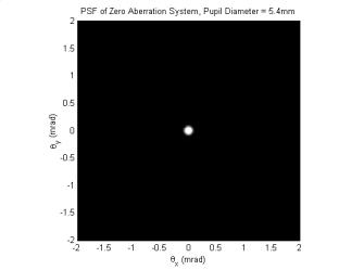 Figure 10 shows the PSF images for a 4 mm pupil diameter at λ = 570 nm and an RMS wavefront error equal to 0.3 micron = 0.53 λ. The PSFs were scaled to achieve saturation to make the fine spatial structure more visible in the images.