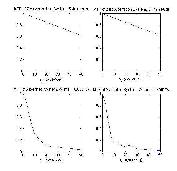 Figures 11 and 12 plot the MTFs, up to 6th order for 4 mm and 7.3 mm pupil diameters at λ = 570 nm, and an RMS wavefront error equal to 0.114 micron = 0.2 λ . An RMS wavefront error of 0.07 λ or lower is considered diffraction limited, i.e. the aberration is small enough so effectively the light is only affected by diffraction.