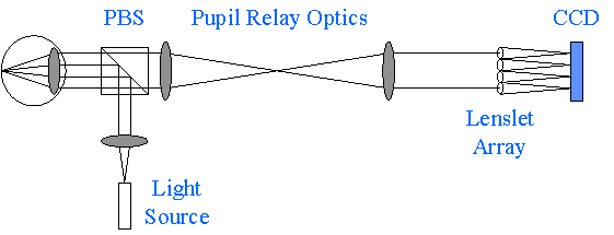 A schematic layout of the Shack-Hartmann Wavefront Sensor is shown in Figure 16. A polarized light source is used to produce a small spot on the retina. The diffuse reflected light that propagates back through the lens and cornea and out of the eye is relayed to the plane of the lenslet array. Any specularly reflected light will be reflected out of the return path by the polarization beam splitter (PBS). The relay optics is used to image the pupil of the eye onto the plane of the lenslet array.